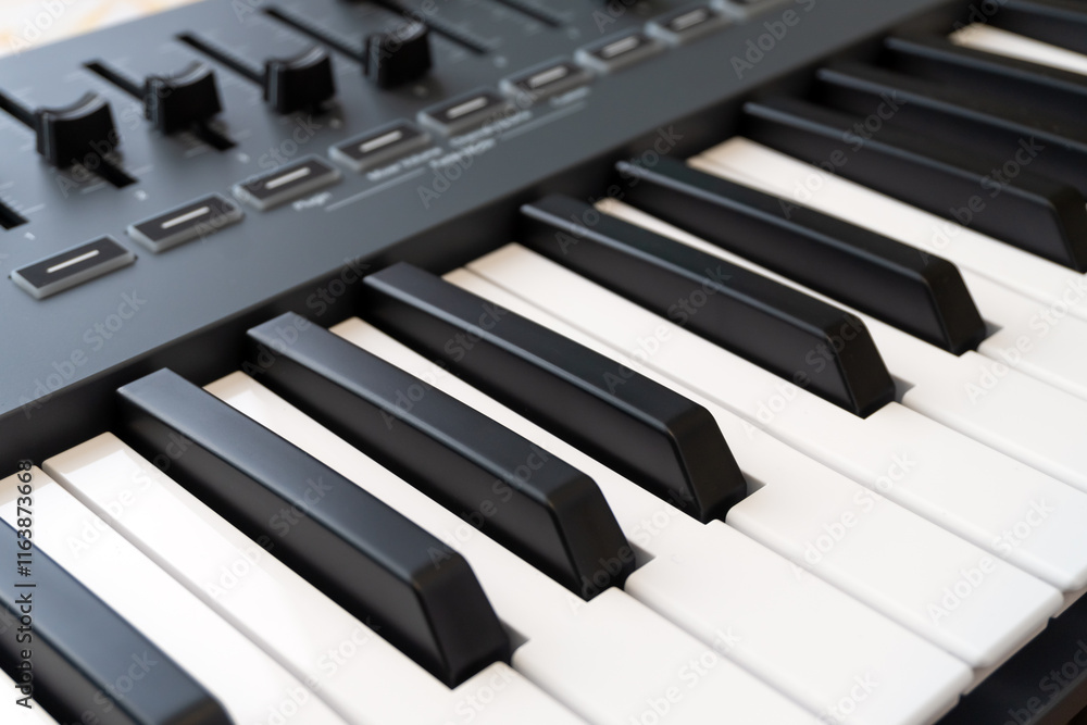 Close up of music instrument synthesizer keyboard with buttons and faders.