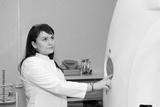 A brunette female doctor pushing control button on CT scanner. Computerised tomography