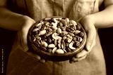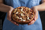Womans hands holding a wooden bowl with mixed nuts. Healthy food and snack. Walnut, pistachios, almonds, hazelnuts and cashews.