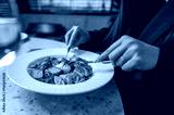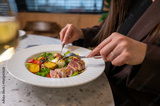 A close-up of a person enjoying a gourmet salad, featuring diced vegetables, protein, and garnishes. Elegant presentation in a modern dining setting with a glass of wine nearby.