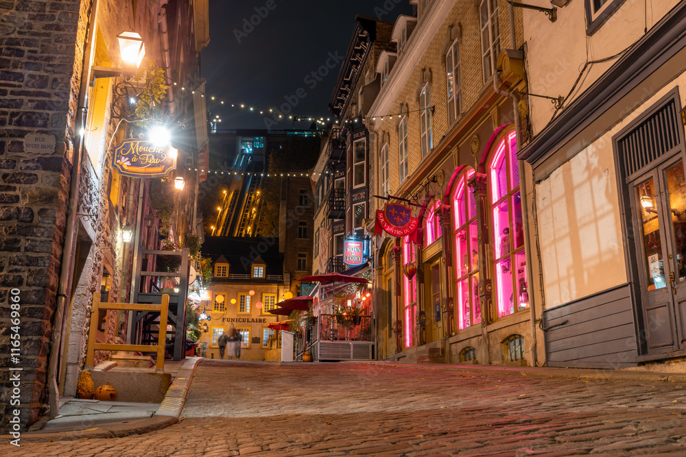 Quebec, Canada - October 18 2021 : Night view of the Quebec City Old Town in autumn. Rue Sous-le-Fort.