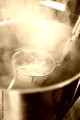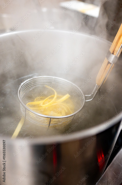 A close-up of pasta being cooked in boiling water, steaming as it emerges from a metallic strainer. The scene captures the essence of cooking and culinary delight.