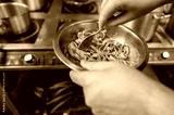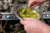 A chef mixes freshly cooked green fettuccine pasta in a stainless steel bowl. The kitchen background features cooking equipment and a modern stovetop, suggesting a professional cooking environment.