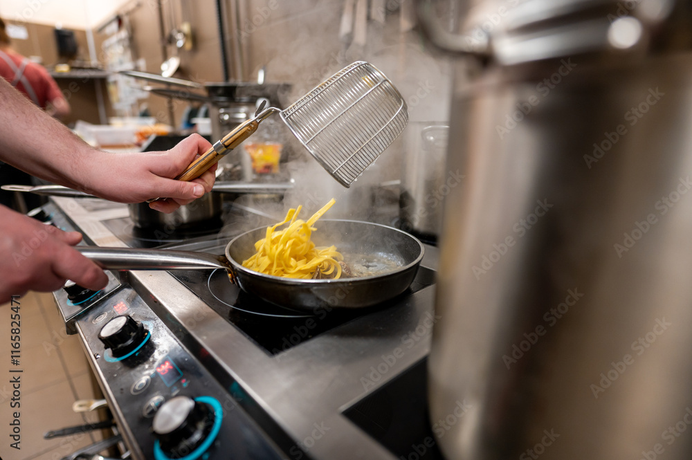 A chef skillfully tosses fresh pasta in pan, creating steam in busy kitchen. The scene captures the art of cooking and the vibrant atmosphere of culinary creativity. Perfect for food-related projects.