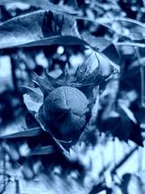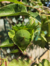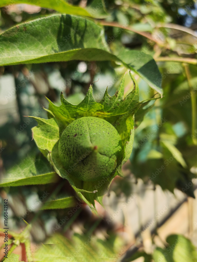Tree Cotton Plant. Gossypium herbaceum. Close up of green color Cotton Boll on Cotton plant.Green cotton field.Organic boll.Cotton boll hanging on plant.Natural Background. Green color boll.With Sele
