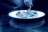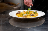 A chef plating a delicious pasta dish with clams, garnished with fresh herbs, in a professional kitchen setting. The focus is on the vibrant colors and textures of the meal.