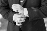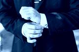 Close-up of elegance male hands wearing modern suit. Man dressed in blue suit and white shirt standing over green nature background. Groom, graduate or businessman. Formal style of clothes.
