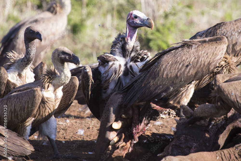 Vultures sitting on ground after eating ready to fly