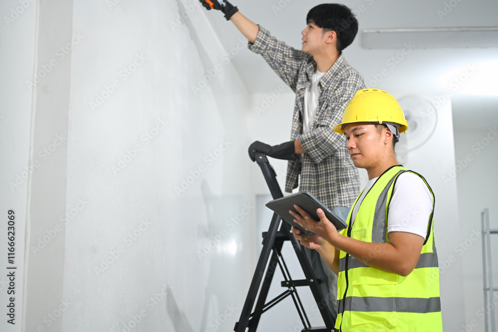 Asian supervisor with digital tablet overseeing painting work at construction site