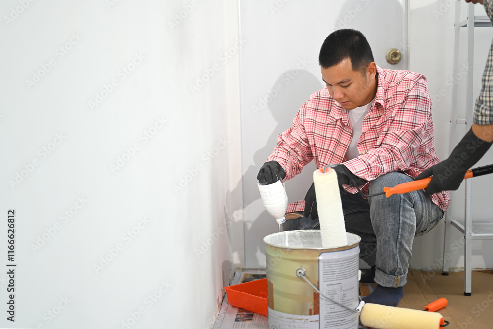 Two men decorating room in new home painting wall together