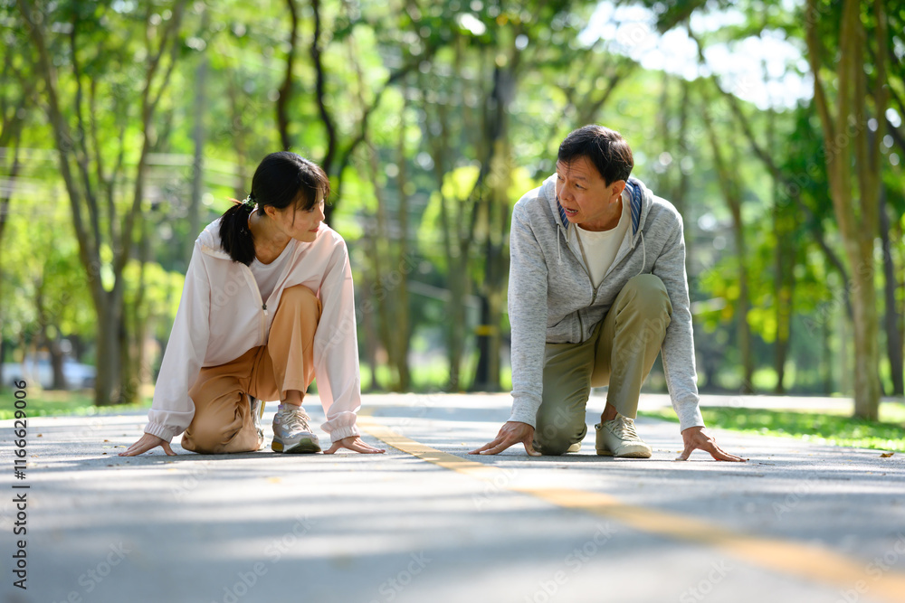 Young woman and middle aged father crouching down in starting position on pathway in a park