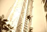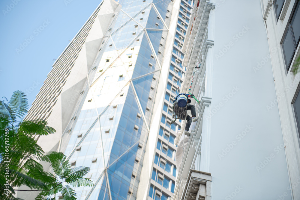 Professional Asian industrial climber worker at height cleaning outside high rise building tower in Hanoi, mountaineering deploys rope access perform tasks at difficult-to-access locations