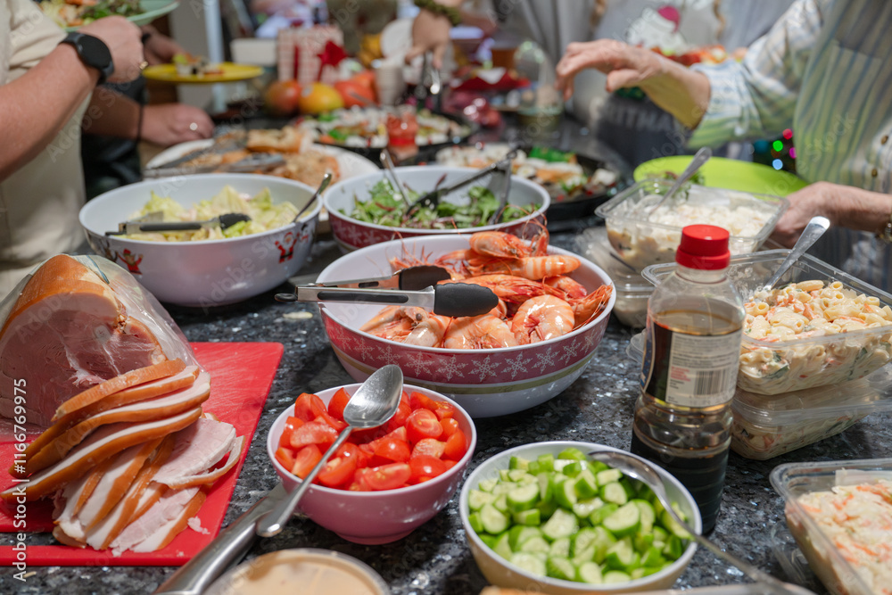 Christmas lunch, Australia family food celebration, seafood prawns salad buffet, authentic home celebration