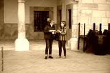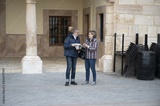 Two tourists women discussing a map while standing in a historic courtyard with stone columns, during a spanish village tour