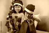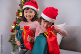 サンタ帽をかぶった姉妹とクリスマスギフト