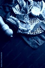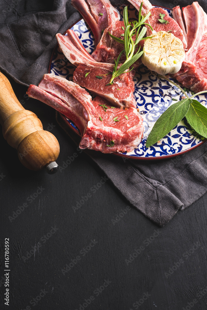 Raw uncooked lamb chops with herbs and spices on bright plate over dark wooden background, top view, selective focus, copy space, vertical composition