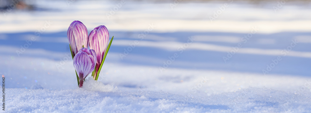 Crocuses - blooming purple flowers making their way from under the snow in early spring, closeup with space for text, banner