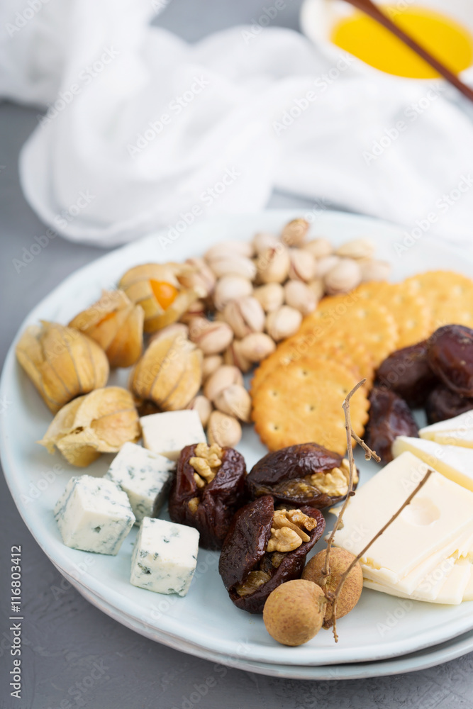 Cheese plate with crackers, dates and nuts