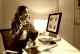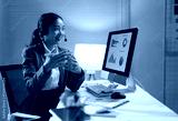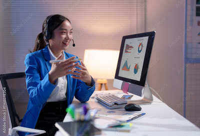 Young professional woman wearing a headset, engaging in a video call while explaining charts displayed on her computer screen during late-night hours in the office
