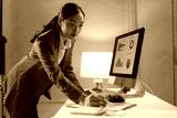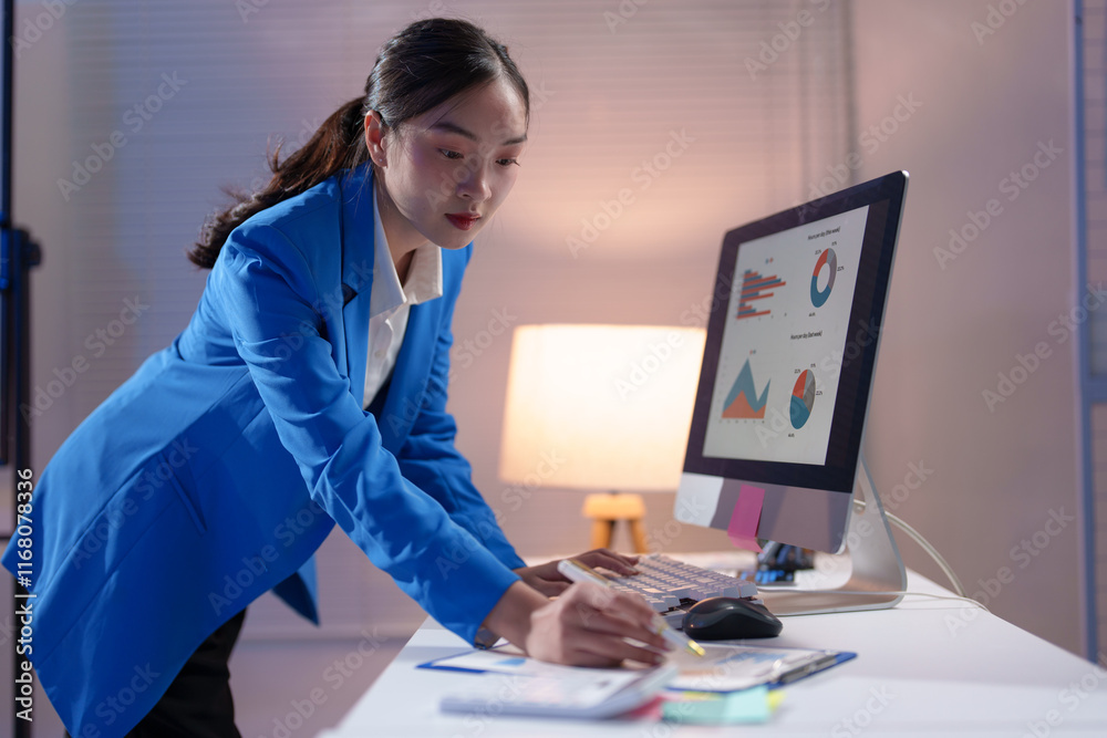 Young professional asian businesswoman in a blue jacket analyzing charts and graphs on a computer screen while taking notes in a modern office setting