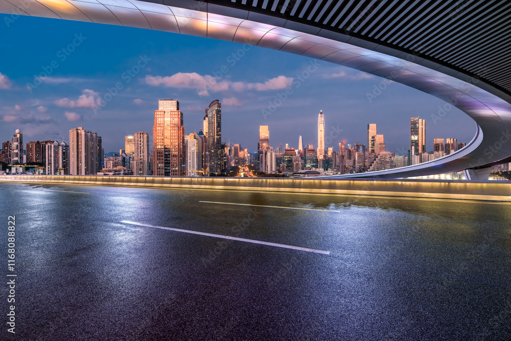 Asphalt highway road and bridge with modern city buildings at night in Shenzhen, China. Outdoor road background.