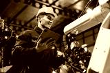 Robotic engineer automatic mechanic checking quality system of automation robot arms machine in factory. Service programming machinery welding robots in production at factory industry.