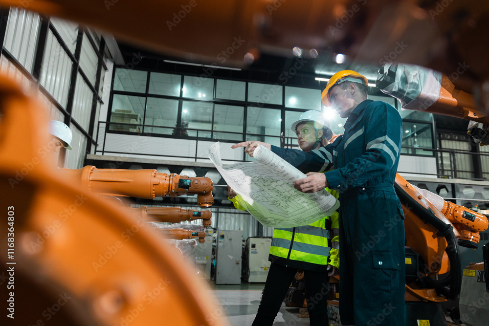 Robotic engineer team automatic holding blueprint checking Plan system of automation robot arms machine in factory. Service programming machinery welding robots in production at factory industry.