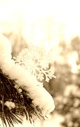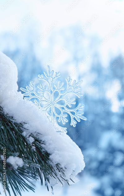 winter nature background. decorative snowflake on snowy pine tree close up. symbol of Christmas and New Year holidays. winter festive season.