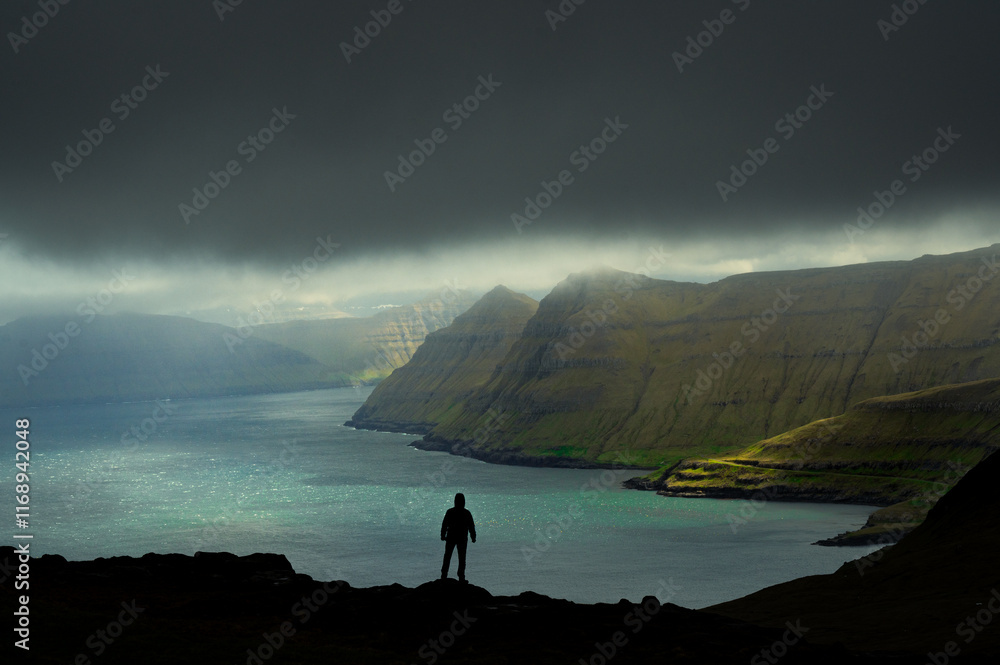 silhouette of a person watching the sea in a cliff of the Faroe Islands