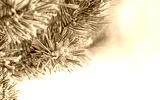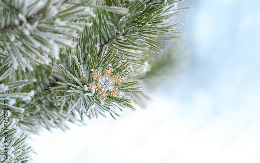Beautiful snowflake brooch on snowy pine tree outdoor, abstract nature background. Snowflake jewelry decoration with rhinestone close up. style decor for festive winter season, christmas, New Year