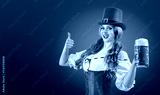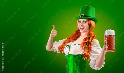 Happy Irish girl holding big mugs with beer or ale. Young red-haired woman аs green Leprechaun elf character for advertising. St. Patrick's Day party. Ireland National Independence Day March 17th