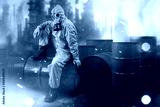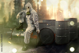 A man in a gas mask and protective suit sitting on a barrel of chemical waste. Environmental pollution concept. Dirty air with dust and noise, grunge effect.