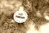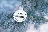 Beautiful winter background. snowy covered fir tree branches and paper card with text "Hello February" close up. January month calendar concept. frosty cold weather. Winter holidays atmosphere.