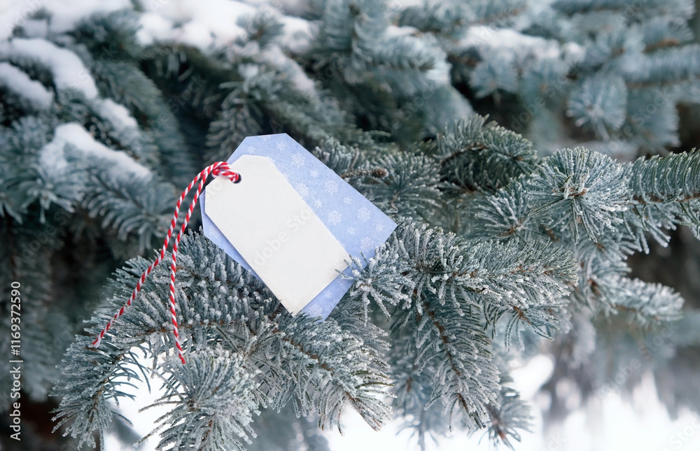 Beautiful winter background. snowy covered fir tree branches and empty paper card close up. frosty cold weather. Winter holidays atmosphere. copy space. template for design