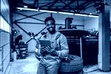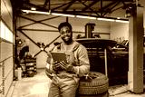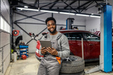 Portrait interracial car service worker leaning on pile of tires and using tablet for digital car service at automotive service center.