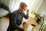 Young freelancer putting his eyeglasses and looking at his project on a computer at home office.