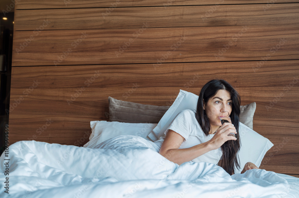Young Woman Drinking Water in the Bed in the Morning. Healthy Start of the Day Concept