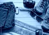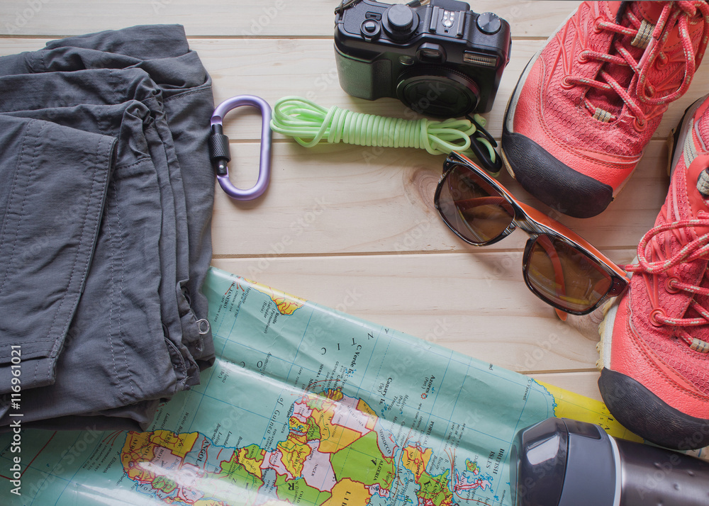 Top view of travel accessories for a mountain trip on old wooden background : hiking boots, pants, camera, bottle, rope, map, notebook and sunglasses.