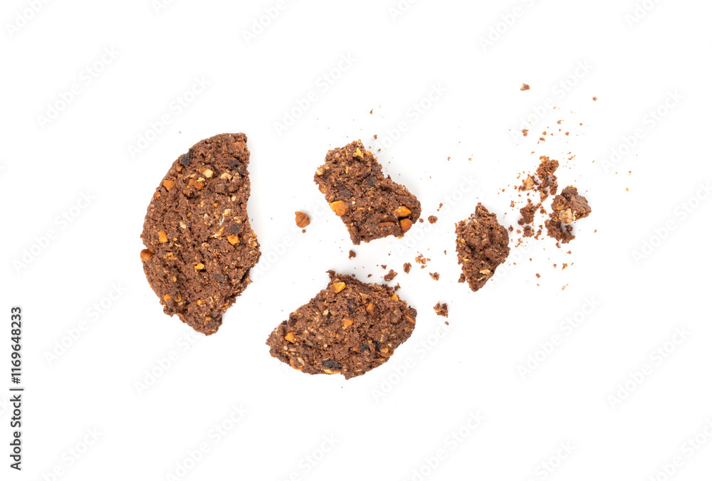 Crumbled chocolate oatmeal cookies isolated, broken cereal oat crackers with nuts