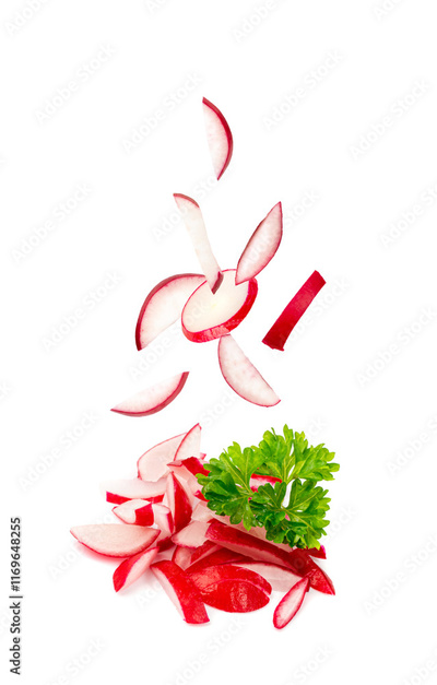 Falling Chopped Radish Roots Isolated, Flying Red Root Cuts, Diced Red Radishes Pile, Sliced Radis