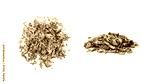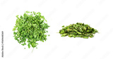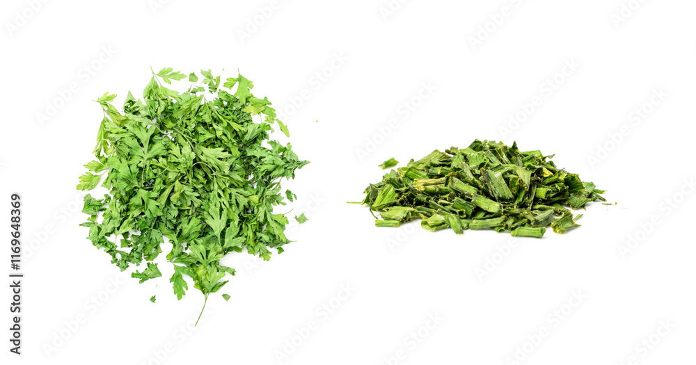 Scattered dry chive pile isolated. Dried green onion flakes, chopped dried spring onion on white