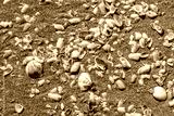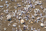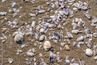 Shells in sand texture background. Seashell on sandy beach nature pattern, ocean dune clams in sunny day