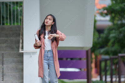 Young asian university student is holding a book and checking the time on her wristwatch while waiting outside a modern building, possibly late for class or an appointment