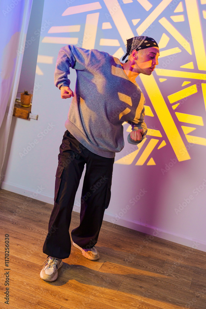 A man in a grey sweatshirt and black pants dances in a studio with a colorful light projection on the wall