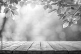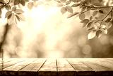 Close up top wooden table with sunny abstract green nature background, blurred bokeh