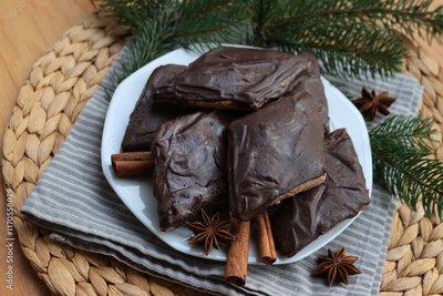 Italian traditional festive cookies called Mostaccioli or Mustaccioli on a plate on wooden table with fir branches. Christmas cookies made mith Pisto, a mix of various spices