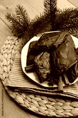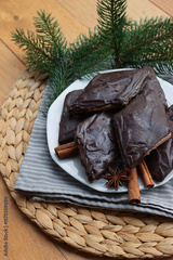 Italian traditional festive cookies called Mostaccioli or Mustaccioli on a plate on wooden table with fir branches. Christmas cookies made mith Pisto, a mix of various spices