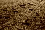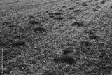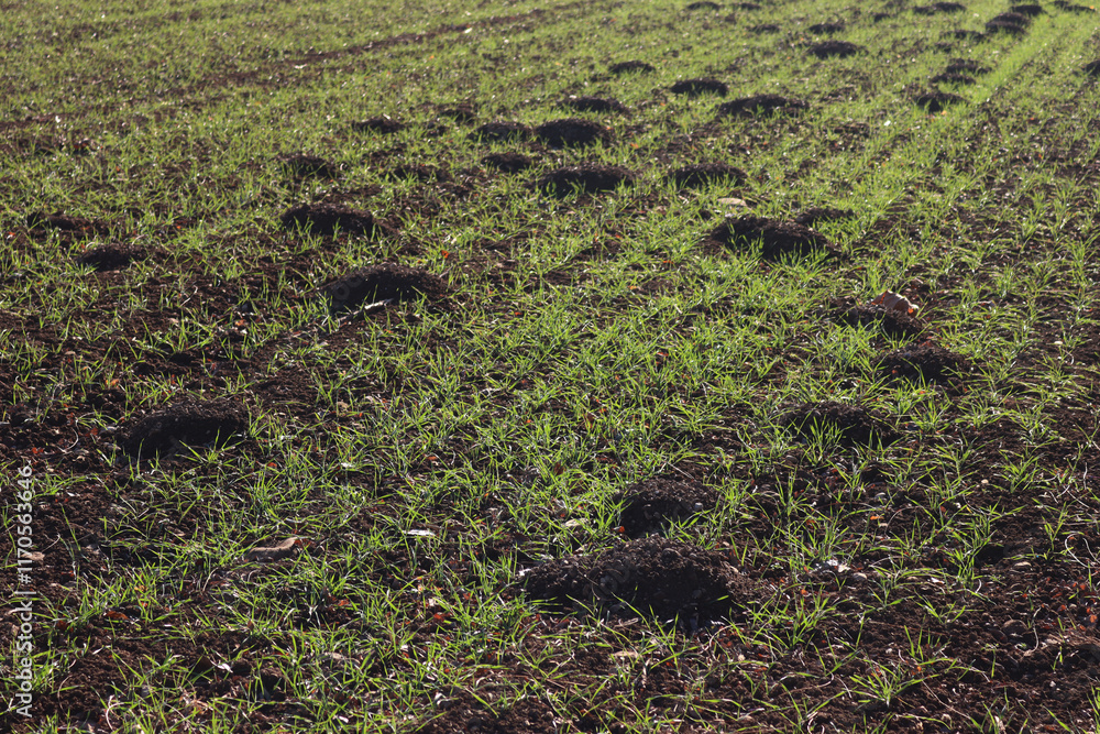 Molehills on wheat field in the italian countryside. Damaged agricultural field by European mole also known as Talpa Europaea