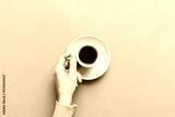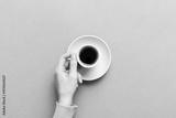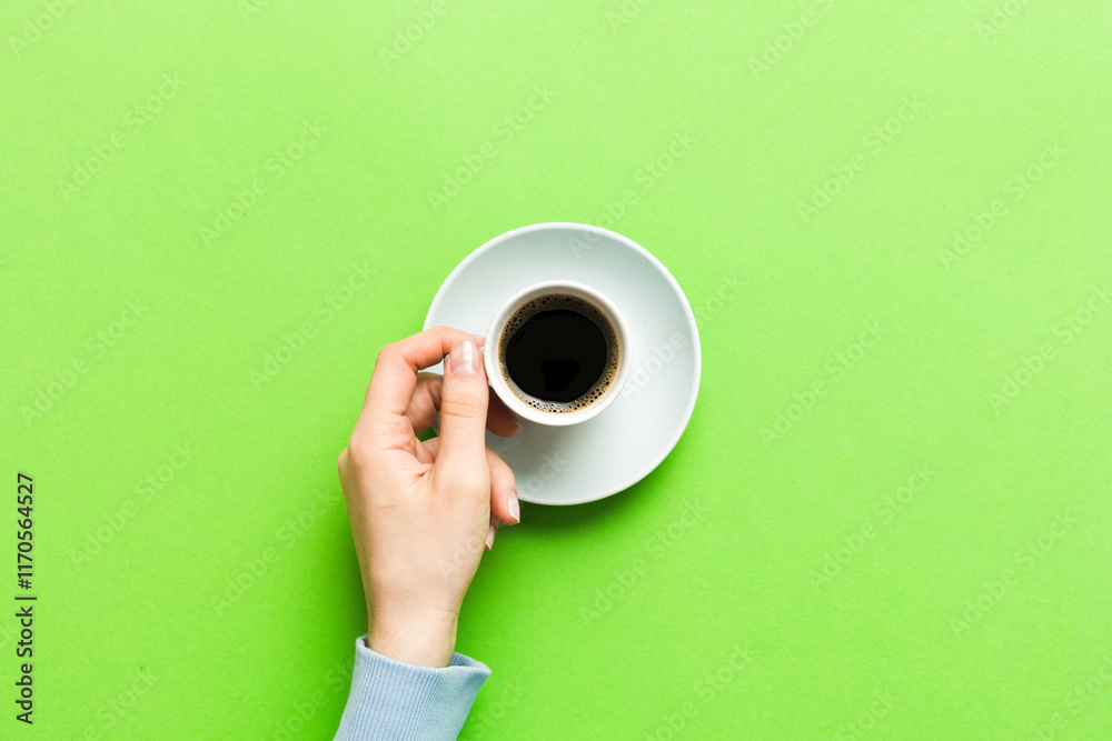 Minimalistic style woman hand holding a cup of coffee on Colored background. Flat lay, top view cappuccino cup. Empty place for text, copy space. Coffee addiction. Top view, flat lay