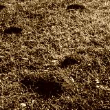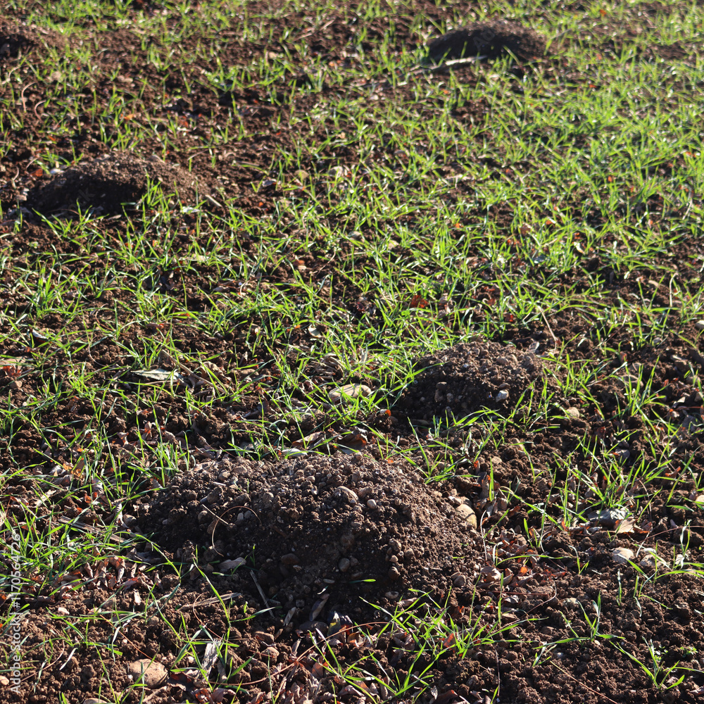 Molehills on wheat field in the italian countryside. Damaged agricultural field by European mole also known as Talpa Europaea